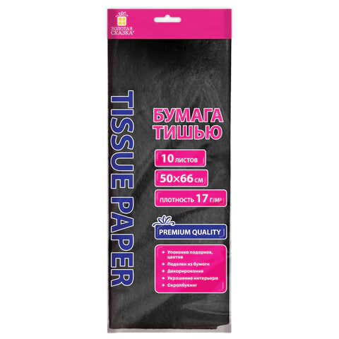 Цветная бумага ТИШЬЮ 17 г/м2, 50х66 см, 10 листов, черный цвет, ЗОЛОТАЯ СКАЗКА, 1 шт