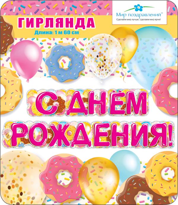 Гирлянда С Днем Рождения! (пончики), Розовый, 160 см, 1 шт.