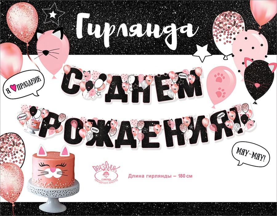 Гирлянда С Днем Рождения! (шарики-котята), Черный/Розовый, с блестками, 180 см, 1 шт.