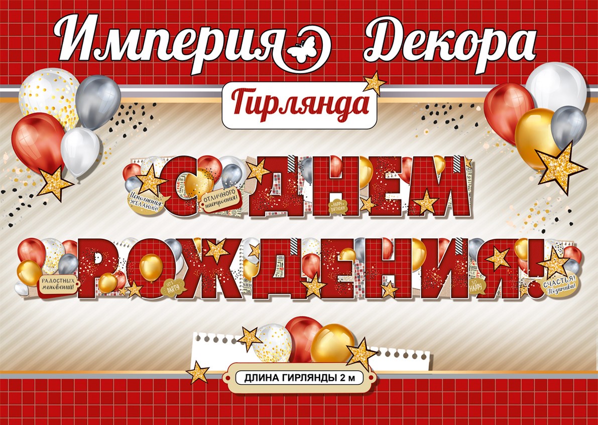Гирлянда С Днем Рождения! (золотые звезды), Красный, 200 см, 1 шт.
