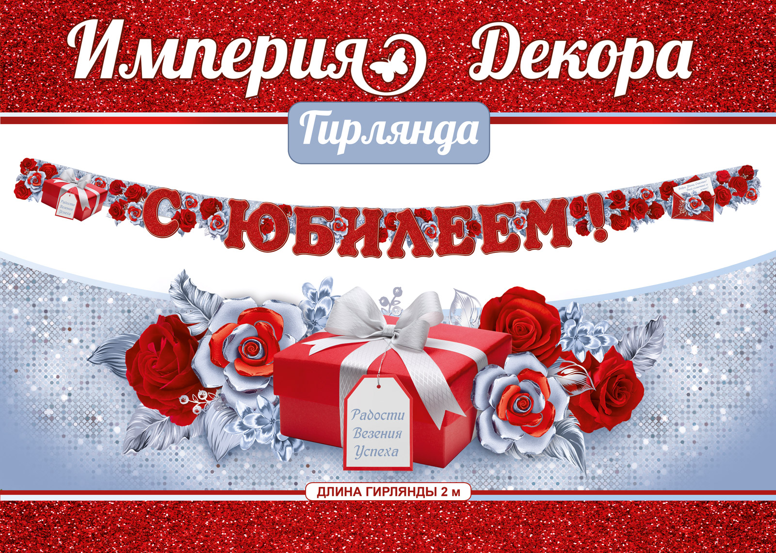 Гирлянда С Юбилеем! (подарок и розы), Красный, 200 см, 1 шт.