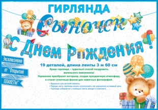 Гирлянда Сыночек, С Днем Рождения! (мишка и шарики), Голубой, 360 см, 1 шт.