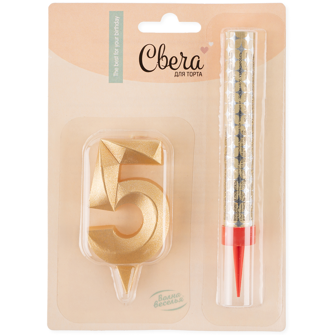 Набор, Фонтан и Свеча Цифра, 5 Грани, Золото, 10 см, 1 шт.