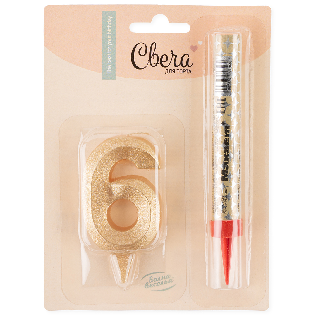 Свеча тортовая цифра 6 «золотая»,1 шт.