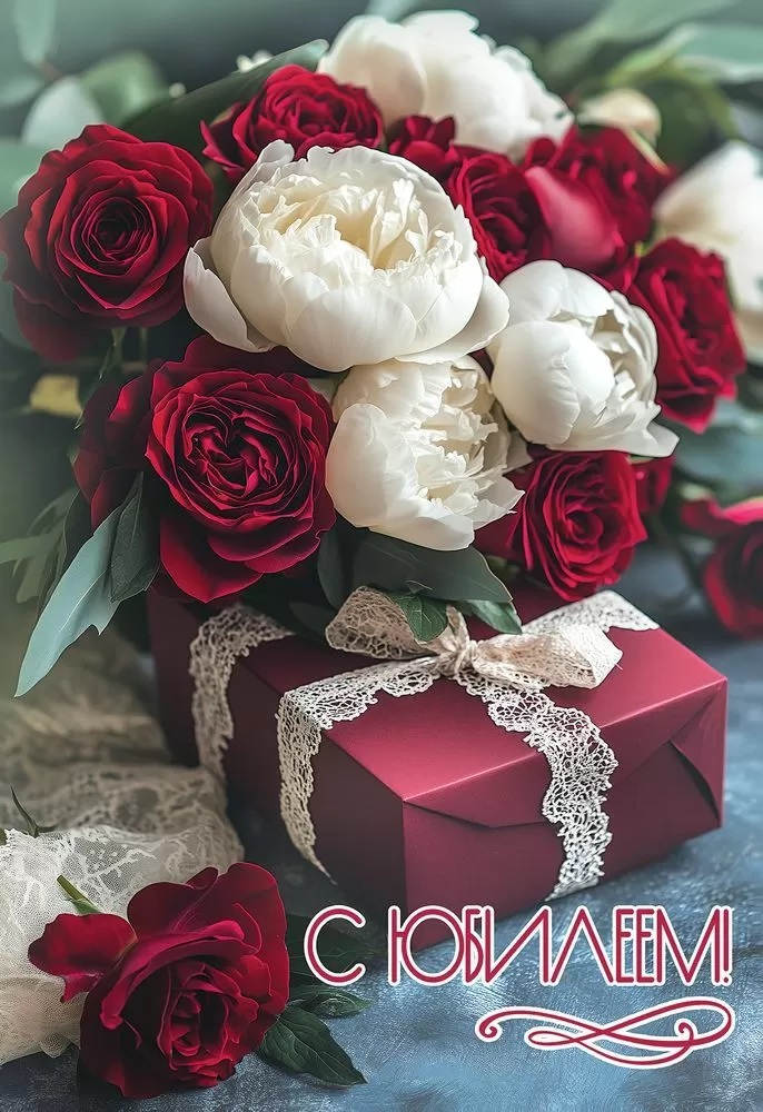 Открытка, С Юбилеем! (цветы и подарок), 12,2*18,2 см, 1 шт.