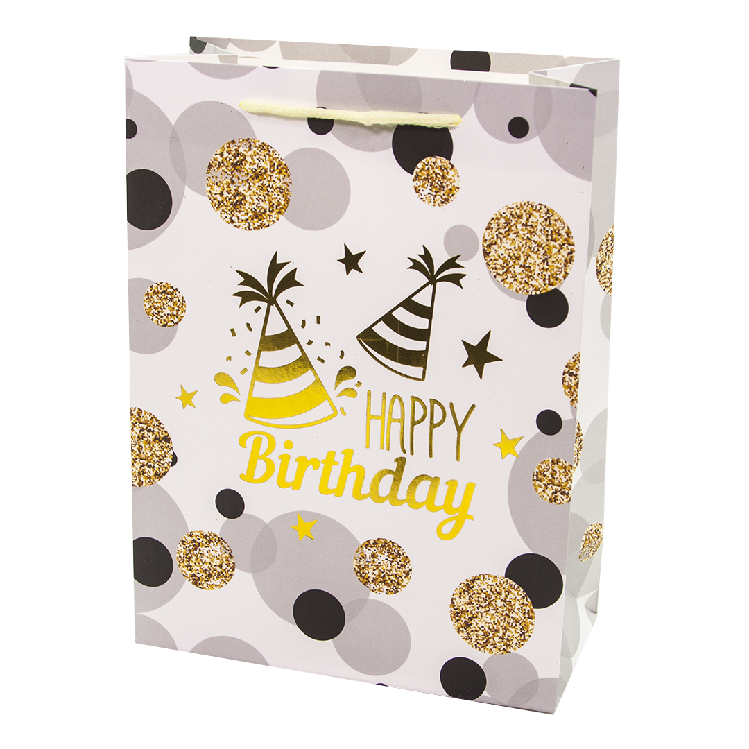 Пакет подарочный, С Днем Рождения! (золотые колпаки), Металлик, 24*18*9 см, 1 шт.