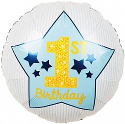 Шар (18»/46 см) Круг, 1-ый День Рождения Мальчика (звезды), Голубой, 1 шт.