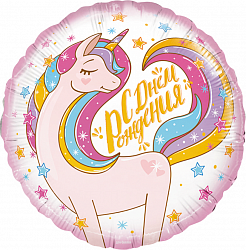 Шар (18»/46 см) Круг, С Днем Рождения (единорог), в упаковке 1 шт.
