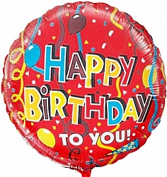 Шар (18»/46 см) Круг, С Днем рождения (ленты), Красный, 1 шт.