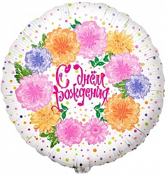 Шар (18»/46 см) Круг, С Днем рождения (разноцветные цветы), на русском языке, 1 шт.
