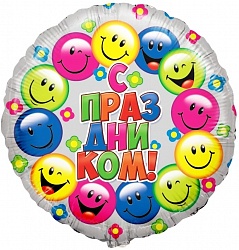 Шар (18»/46 см) Круг, С праздником (разноцветные смайлы), на русском языке, 1 шт.