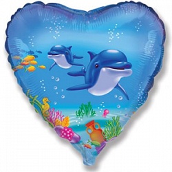 Шар (18»/46 см) Сердце, Счастливый дельфин, Голубой, 1 шт.