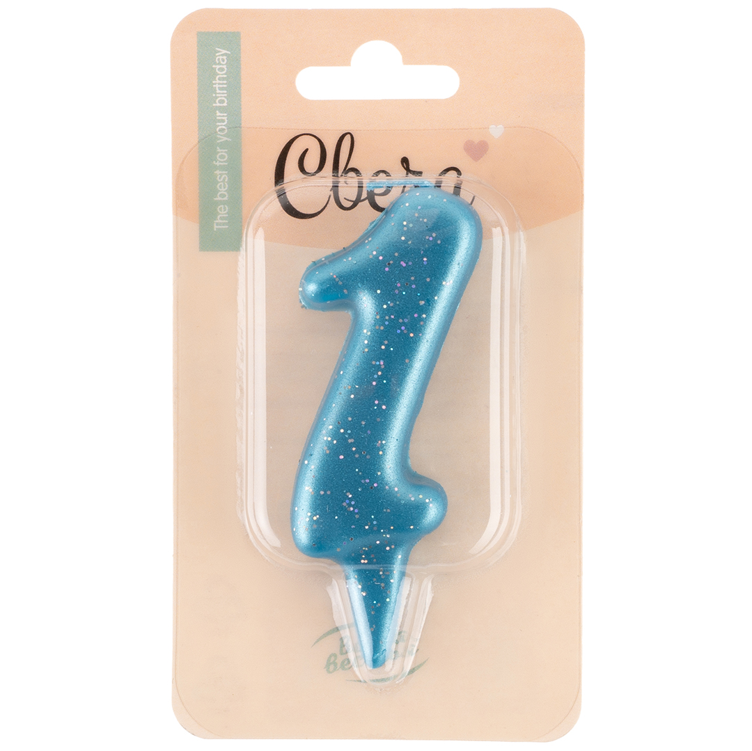 Свеча Цифра, 1 Овал, Синий, с блестками, 8 см, 1 шт.