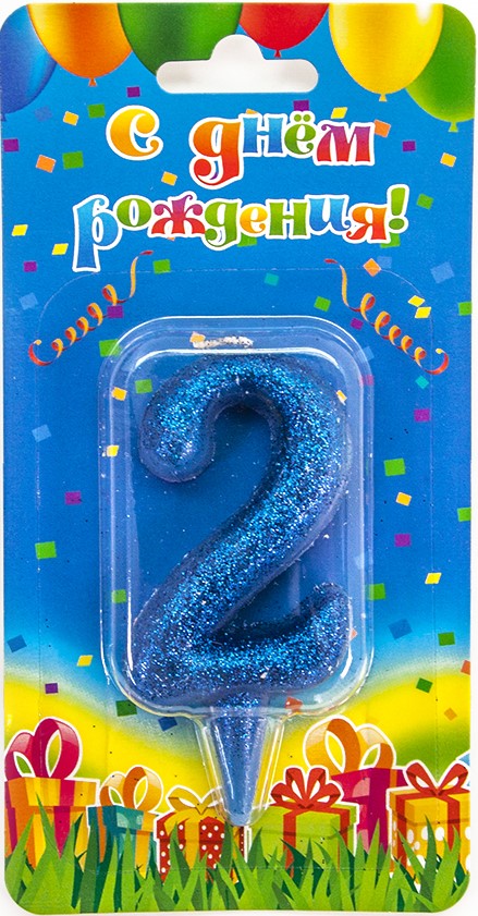 Свеча Цифра, 2 Овал, Синий, с блестками, 8 см, 1 шт.