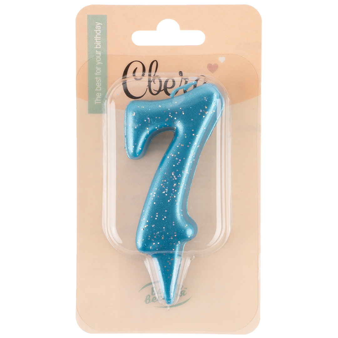Свеча Цифра, 7 Овал, Синий, с блестками, 8 см, 1 шт.