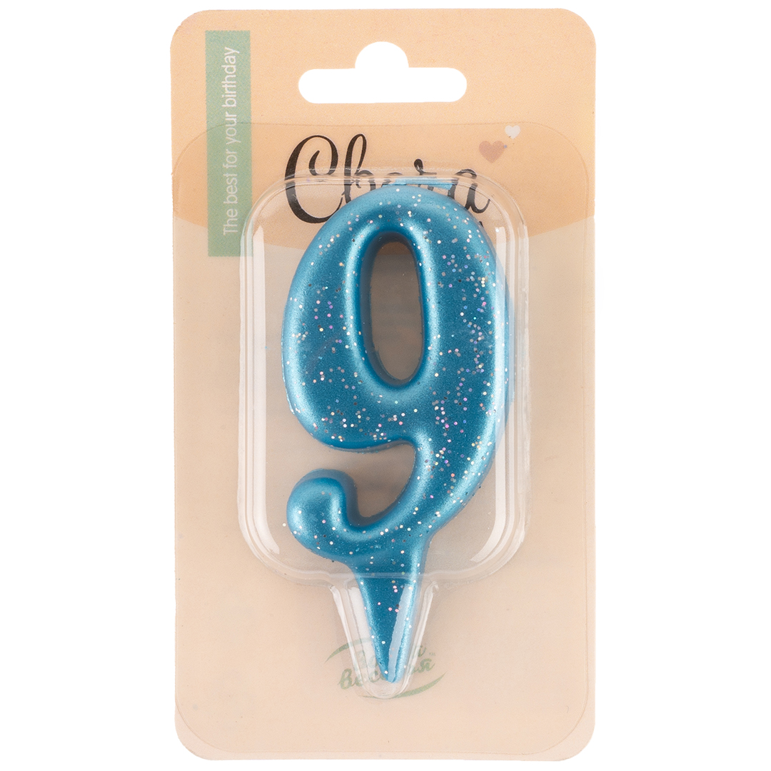 Свеча Цифра, 9 Овал, Синий, с блестками, 8 см, 1 шт.