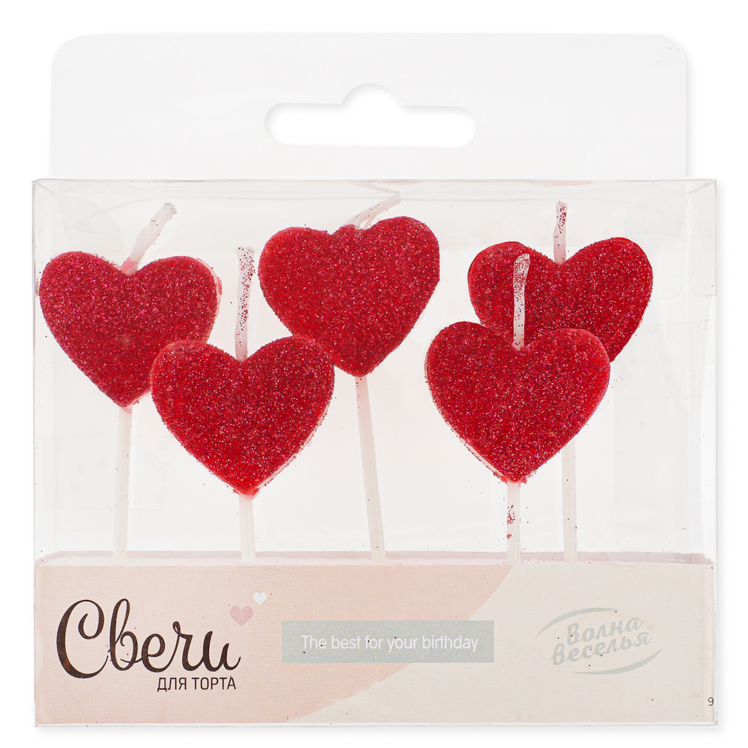 Свечи Сердце, Красный, с блестками, 6 см, 5 шт.