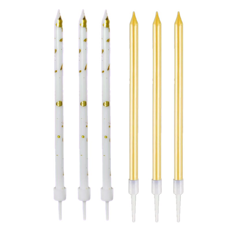 Свечи тортово-коктейльные Белые с золотом микс с держателями / 6 шт., 12 см /