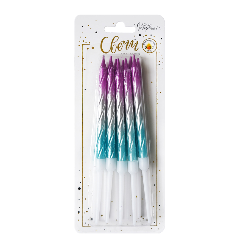 Свечи тортовые классические Витые Градиент Серебро-розовый-синий с держателями / 10 шт., 8 см /