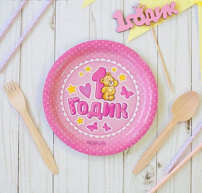 Тарелка бумажная «1 годик», розовый цвет (18 см — 10 шт)