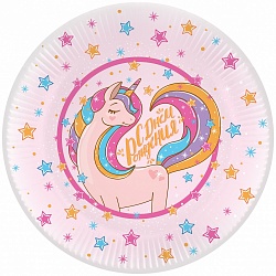 Тарелки (7»/18 см) С Днем Рождения (единорог), Розовый, 6 шт.